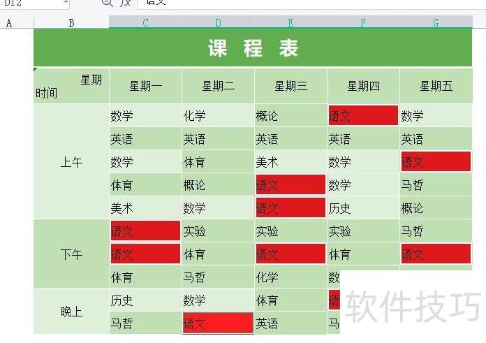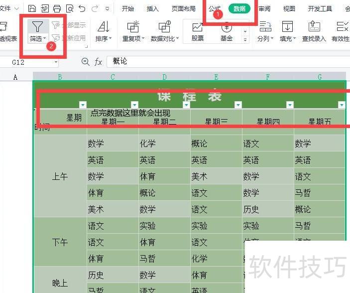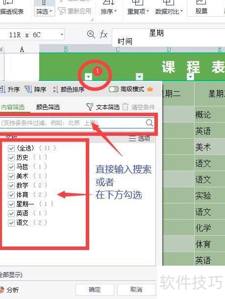 在表头选择需筛选的列内容,可参照图中红框所示位置。以筛选星期一的语文为例,先点击单元格下方的小三角展开按钮,在弹出的选项中直接输入语文进行搜索,或取消其他项目勾选,仅保留一项,确认选择后点击确定即可完成筛选操作。