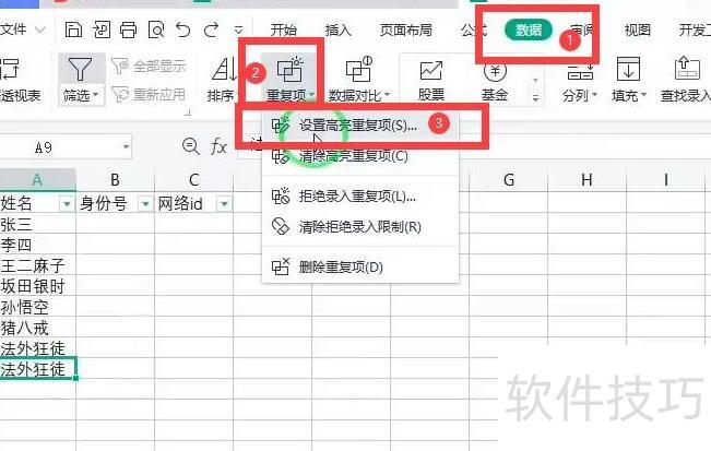 在数据菜单的功能区中,找到重复项按钮(中数字2所示),点击后从下拉菜单中选择设置高亮重复项(对应图中数字3位置)。