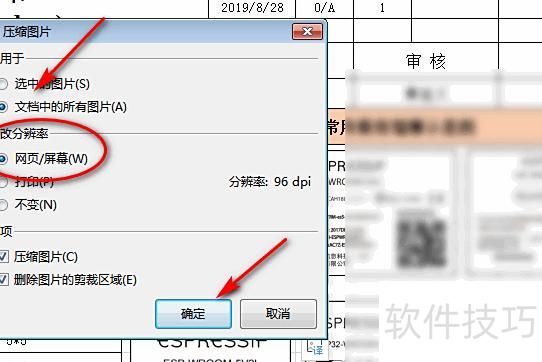 在压缩图片菜单中,选择应用于所有图片,将分辨率设为网页/屏幕,然后点击确定。