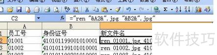 首先打开电脑中的Excel,以示例形式新建一个简易表格。在C2单元格中输入公式:=ren &A2&.jpg &B2&.jpg,该公式用于字符串拼接,作用是将A2单元格对应的文件重命名为B2单元格的内容,并保留.jpg格式。按下回车键后生成结果,再通过拖动填充柄将公式快速应用至整个C列,完成所有行的数据生成。