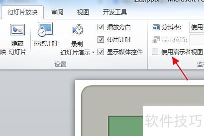 点击幻灯片放映中的使用演讲者视图,勾选该选项,即可启用演讲者模式,操作所示。
