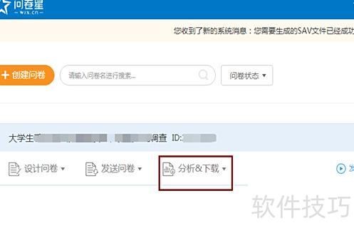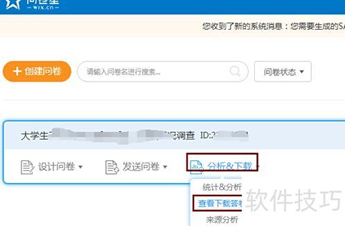 进入问卷星首页,找到你创建的问卷,点击下方的分析下载即可。