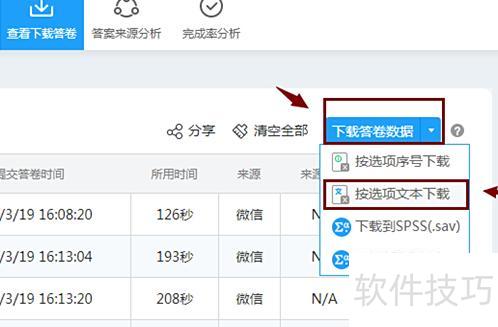进入下载答卷页面,点击右上角下载答卷数据按钮,从下拉菜单中选择按文本选项下载。