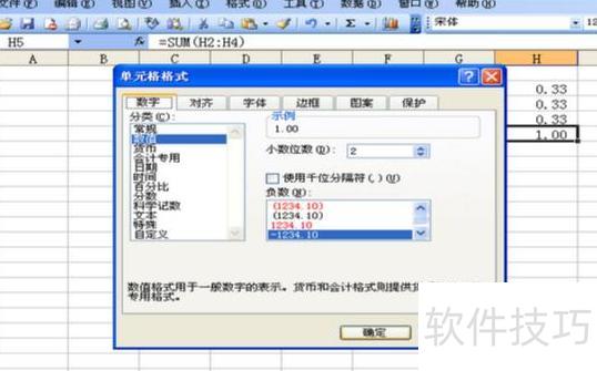 将H2至H4单元格区域设置为数值格式,保留两位小数,1所示。在该区域执行求和操作:=SUM(H2:H4),结果显示为1.00,而非0.99,存在微小差异。