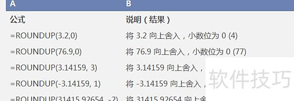 ROUNDUP(数值, 小数位数):将指定数值按要求向上舍入到指定的小数位数。数值为需处理的任意实数,小数位数表示结果保留的位数,两者均为必填参数。