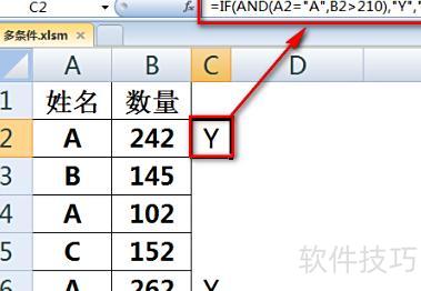 在C2单元格中输入公式:=IF(AND(A2=A,B2>210),Y,),所示。