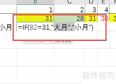 在单元格中输入公式=IF(B2=31,大月,小月)。