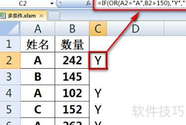 在C2单元格输入公式:=IF(OR(A2=A,B2>150),Y,),按回车后即可实现多条件判断。