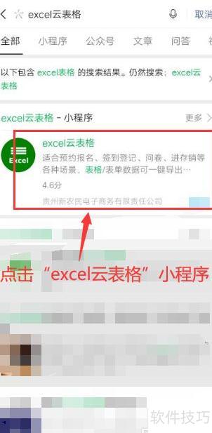 在首页右上角点击搜索图标,输入excel云表格,选择搜一搜 excel云表格,进入搜索结果页面后,点击excel云表格小程序,即可打开其主页面。