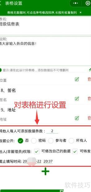 设置表格的列与数据类型后,可配置每人可添加的数据条数、数据公开范围、他人操作权限及填写截止时间等。
