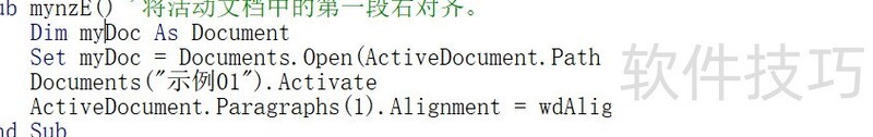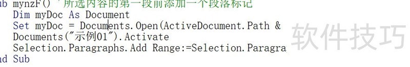 打开当前文档路径下的示例01.docx文件,并将其赋值给变量 myDoc。
