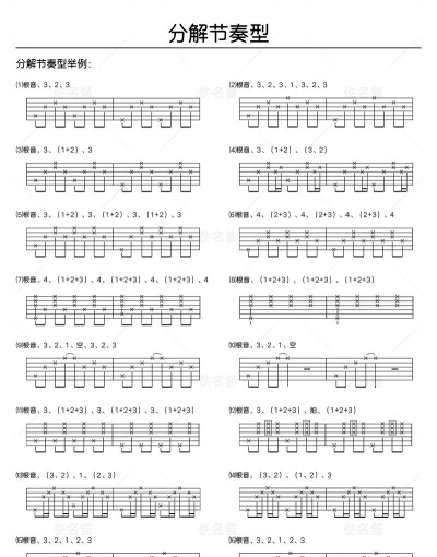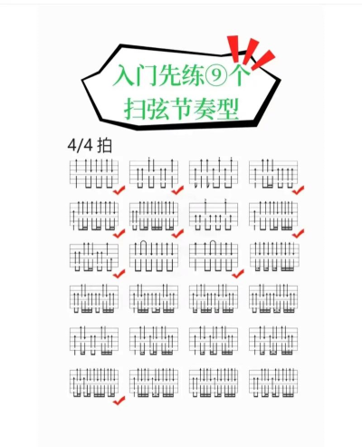 3、常用节奏型解析与练习掌握了基本节奏,就可以学些经典套路了,比如,流行歌曲常用的“下 下上 空上 下上”,这个节奏型非常万能,练熟了能弹很多歌,还有民谣常用的“下 下上 上 下上”,听起来很轻快,练习时,先慢速,一个动作一个动作分解,确保每个音都清晰,再逐渐加速,连成流畅的节奏型,并且,录下自己的练习,对比原版,找出不足。