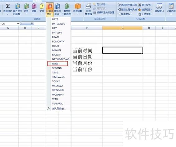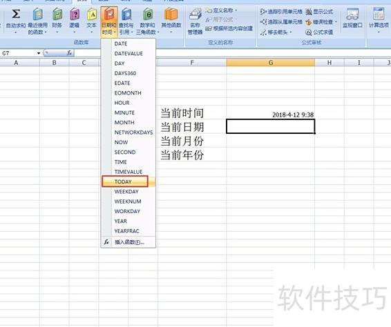 在日期和时间函数中,只需基本英文知识即可理解。若要显示当前时间,可选择使用NOW函数。