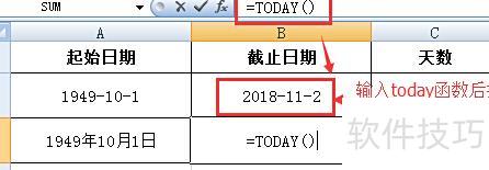 在B2、B3单元格中分别输入TODAY()函数,该函数将显示打开Excel文件当天的日期。