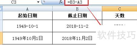 在C2、C3单元格中输入公式=B2-A2和=B3-A3,按回车键确认,完成天数列的计算设置。