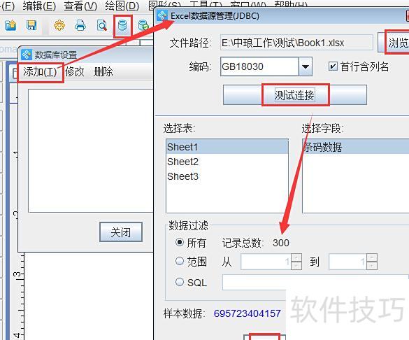 首先打开条形码软件,设置所需纸张尺寸。接着点击菜单栏中的数据库设置,选择添加并选中Excel数据源。在弹出窗口中点击浏览,选取包含条码信息的Excel文件,随后点击测试连接。确认下方显示的记录总数无误后,点击添加按钮,即可完成数据导入操作。整个过程简便快捷,确保数据准确读取。