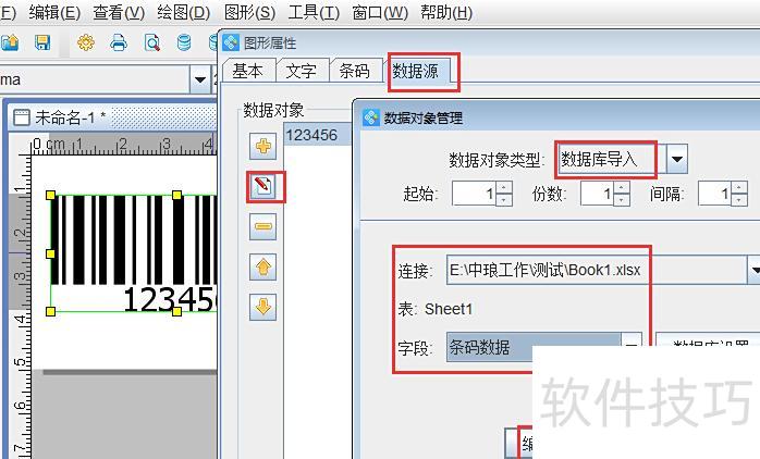 绘制条形码后,双击进入图形属性-数据源,点击左侧修改按钮,选择数据库导入,核对连接数据源和字段名称是否准确,确认无误后,点击编辑并确定完成设置。