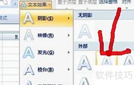 将鼠标移至菜单,点击下的选项,随着鼠标滑动,所选文本的阴影样式将实时变化。