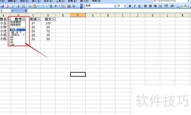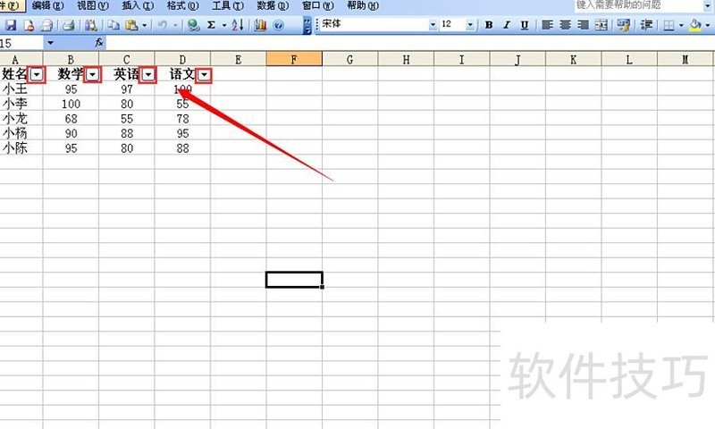 点击自动筛选后,第一行各单元格右侧会出现箭头,点击箭头可选择所需数据,表明筛选已成功设置。