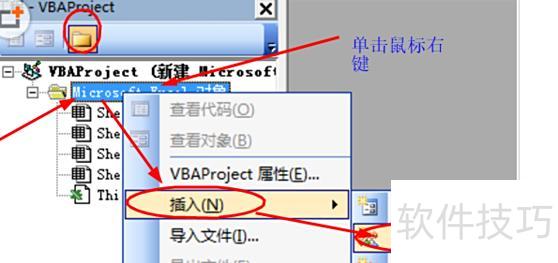 首先按下ALT+F11键打开VBE编辑器,然后在工程窗口中右击Microsoft Excel 对象,接着按照弹出菜单中的图示步骤进行操作。