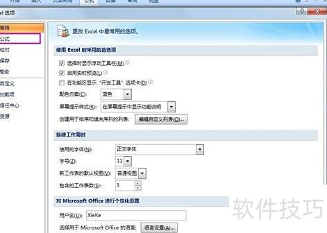 点击按钮后,弹出Excel选项设置窗口,默认显示常用选项卡,需切换至公式选项卡进行设置。