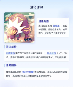 3、进化后的能力变化进化成怪颚龙后,能力大幅提升,攻击和防御,变得非常强悍,属性是岩石和龙,弱点也变少了,不过,速度可能,会稍微慢一点,但总体实力,提升非常明显,是队伍里的,强大物理输出手。