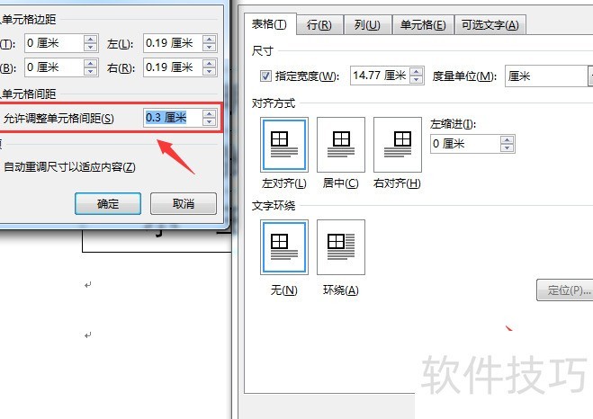 进入表格设置,勾选允许调整单元格间距,并将其设为0.3厘米。