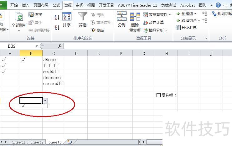 点击菜单栏中的→,在弹出的对话框中选择选项卡,在允许下拉列表中选序列,勾选提供下拉箭头,并在来源框中输入√。