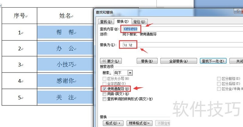 将1 2替换为1 2,两个数字间用两个空格分隔,勾选通配符后执行全部替换。
