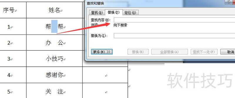 7. 若需将空格分隔的姓名合并,操作更简便:按Ctrl+H,查找内容输入一个空格,替换内容留空,直接点击全部替换即可完成。