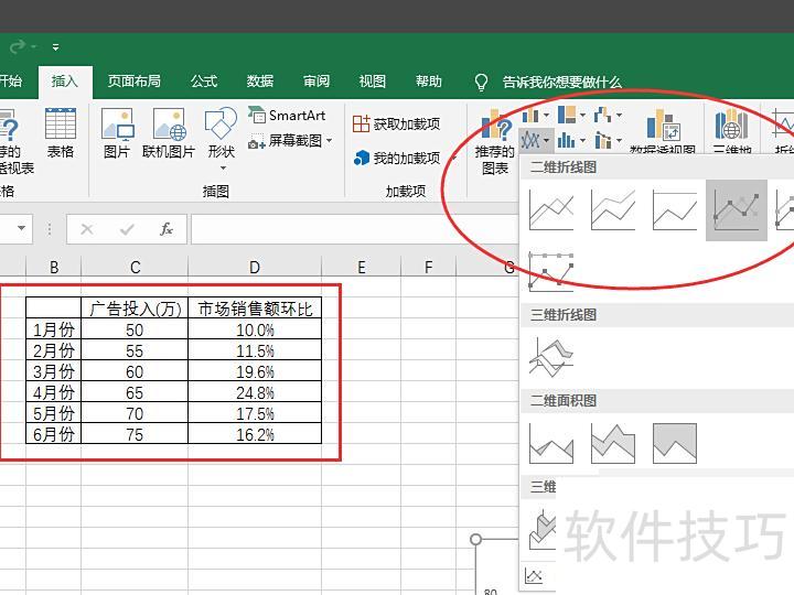 选中全部数据,点击插入,选择二维折线图,即可快速生成图表。