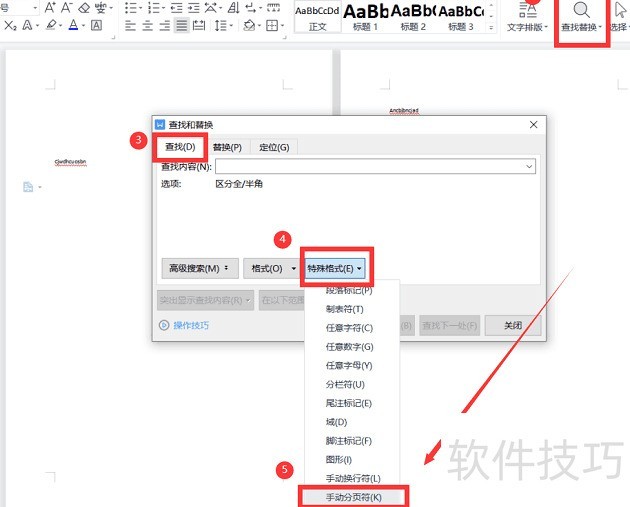 第一步:进入文档开始选项卡,点击查找替换,在弹出窗口的查找框中选择特殊格式,然后点击手动分页符。
