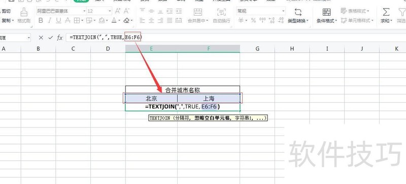 使用公式=TEXTJOIN(,,TRUE,E6:F6)即可将E6至F6单元格内容以逗号连接。