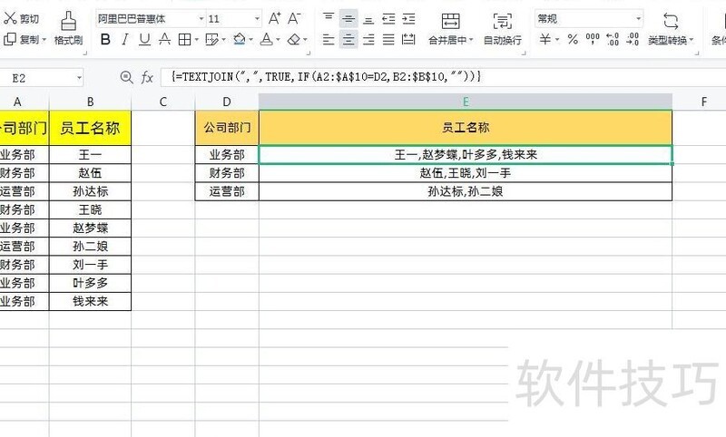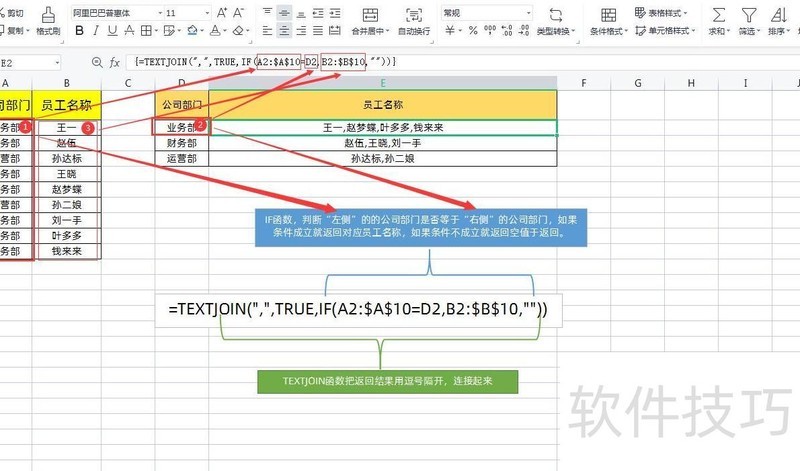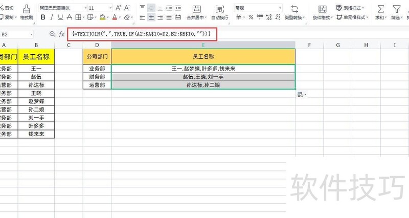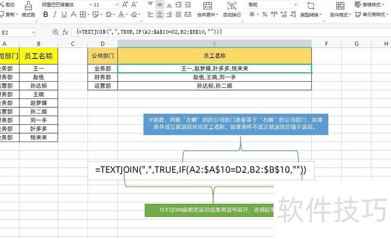 要实现上述功能,可利用IF函数先在左侧表格中筛选出的所有员工姓名,再将这些结果作为TEXTJOIN函数的第三参数进行合并处理即可完成。