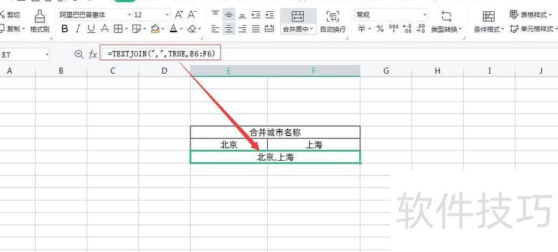 TEXTJOIN函数用法简单,如将两个城市名用逗号连接,见下图所示。