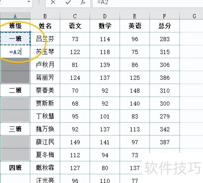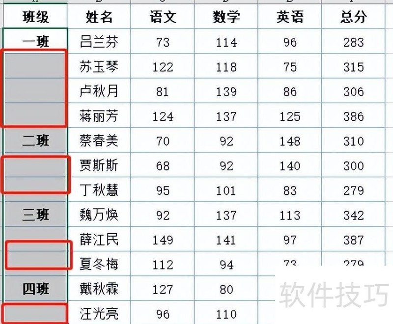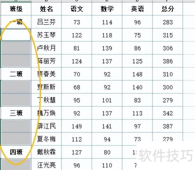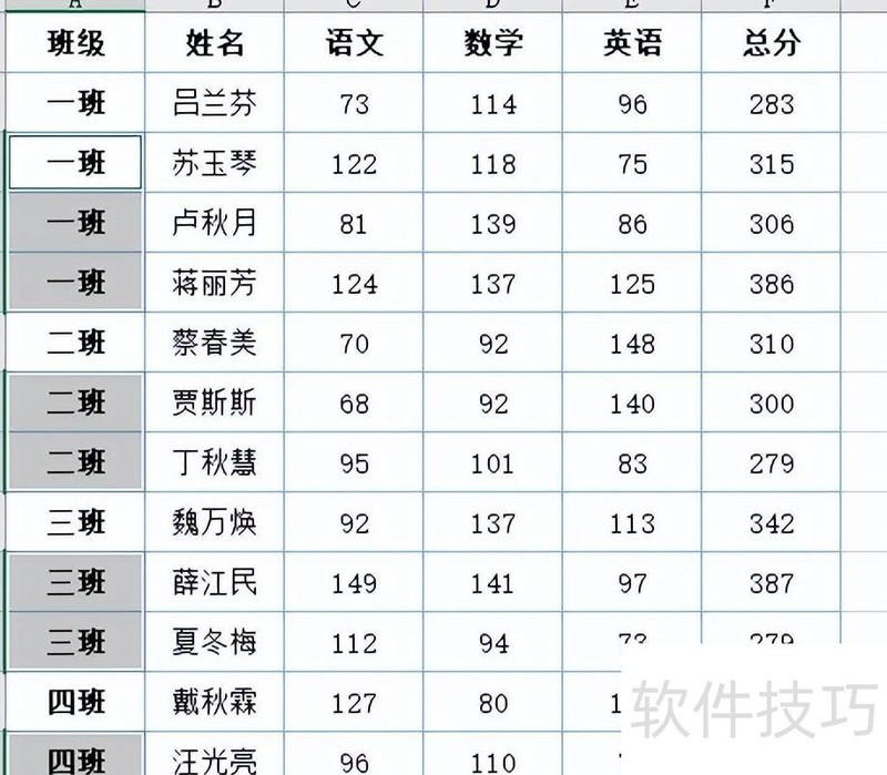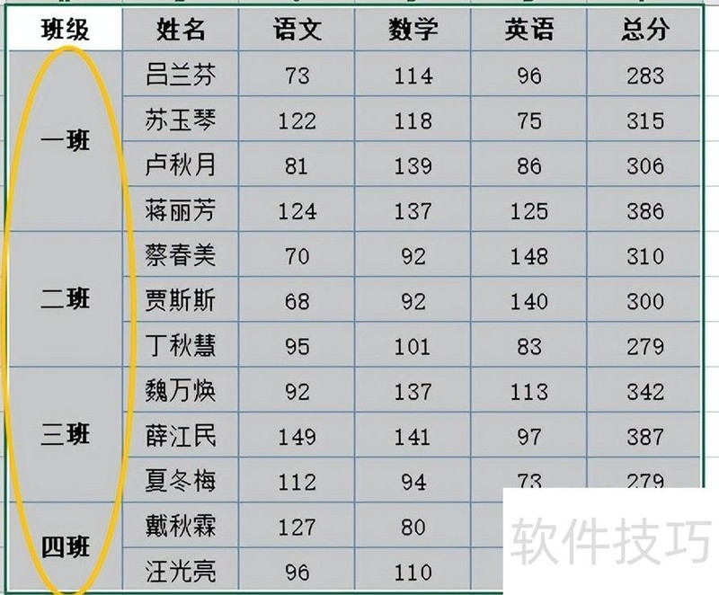 表格中班级列采用合并单元格格式。