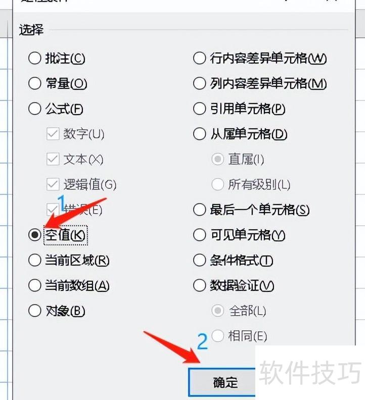 5.4,在弹出的定位条件对话框中,先选空值,再点确认。