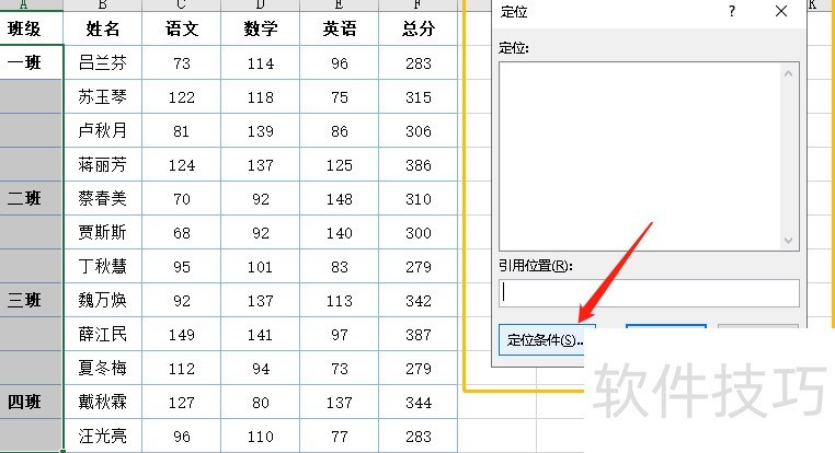 4.3 接下来需将最上方单元格的班级内容填充到下方空白处。先选中A2至A13区域,按下CTRL+G键打开定位对话框,然后点击左下角的定位条件按钮。