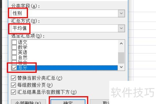 在页面的分类字段下方框中选择性别,汇总方式处选择平均分,在选定汇总项中勾选总分,最后点击确定按钮,即可完成数据汇总操作。