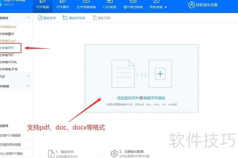 进入迅捷PDF转换器操作界面后,选择左侧文件转PPT功能,导入电脑中保存的Word文档,支持doc和docx两种格式。