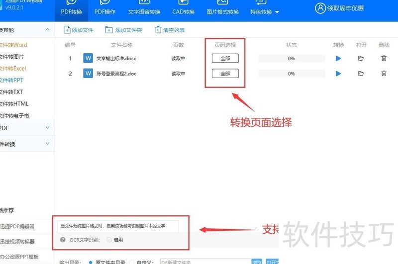 在页面左下角可切换设置,选择是否启用OCR文字识别;也可点击页码选择,手动选取需转换的页面,而非整份文档,最后点击右下角开始转换即可。
