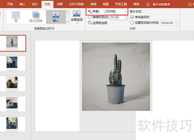若想取消PPT切换效果的声音,可进入切换选项卡,在计时组中将声音设置为无声音即可。