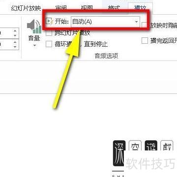 将下方内容中的开始方式设为自动,播放幻灯片时音频便会自动播放。