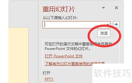 点击重用幻灯片后,页面侧边会出现浏览选项,可选择浏览幻灯片或浏览文件,我选择了后者。