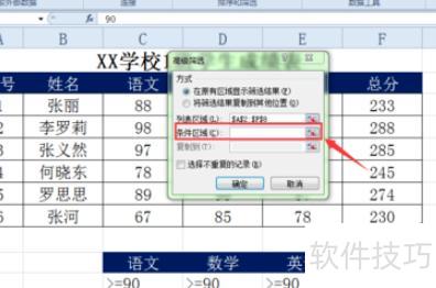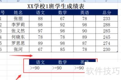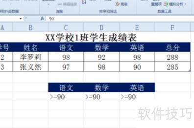 若需筛选语文、数学、英语成绩均高于90分的数据,可使用高级筛选功能实现。
