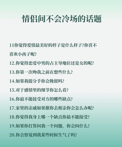 3、深入聊兴趣与梦想除了日常,还要聊点深的,聊聊彼此的兴趣,未来的梦想,比如,你喜欢看什么电影,他有什么爱好,或者,你们将来,想一起去哪里旅行,这些话题,能让你们,更了解对方,发现共同点,甚至,一起规划未来,聊这些时,气氛会变得,更亲密,更有期待感,当然,要注意分寸,别变成审问,轻松愉快地聊,就好。