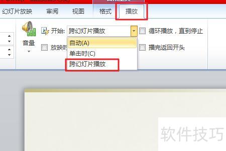在首页幻灯片插入音频,点击音频工具的播放选项,选择开始方式,于下拉菜单中选取跨幻灯片播放即可。