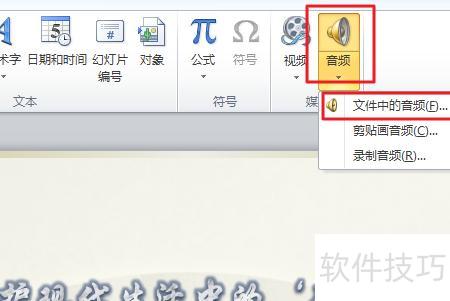 打开PPT,切换到插入选项卡,点击音频按钮,从下拉菜单中选择文件中的音频即可。
