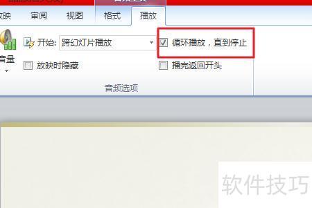 点击选项卡上的其他选项…按钮,在弹出窗口中选择循环播放,直到停止,再依次点击确定,关闭所有对话框即可。