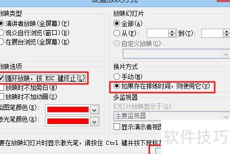 在弹出的对话框中勾选循环放映,于换片方式处选择手动,然后点击确定,即可实现音乐播放与幻灯片自动切换同步进行。